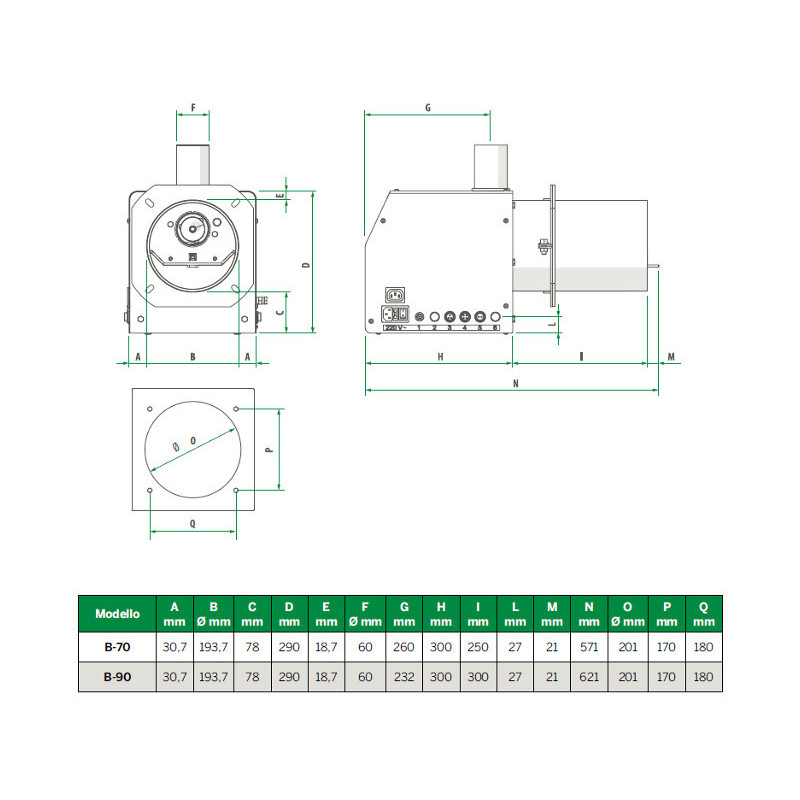 Granulių degiklis su padavimo šneku, Šiluminis galingumas 10-90 kW, Granulių suvartojimas 2-18 kg/val., 5 pakopų galios moduliacija, LED indikacija, Atbulinės liepsnos vožtuvas, Garantija 2 m., Galimas kompresoriaus pajungimas