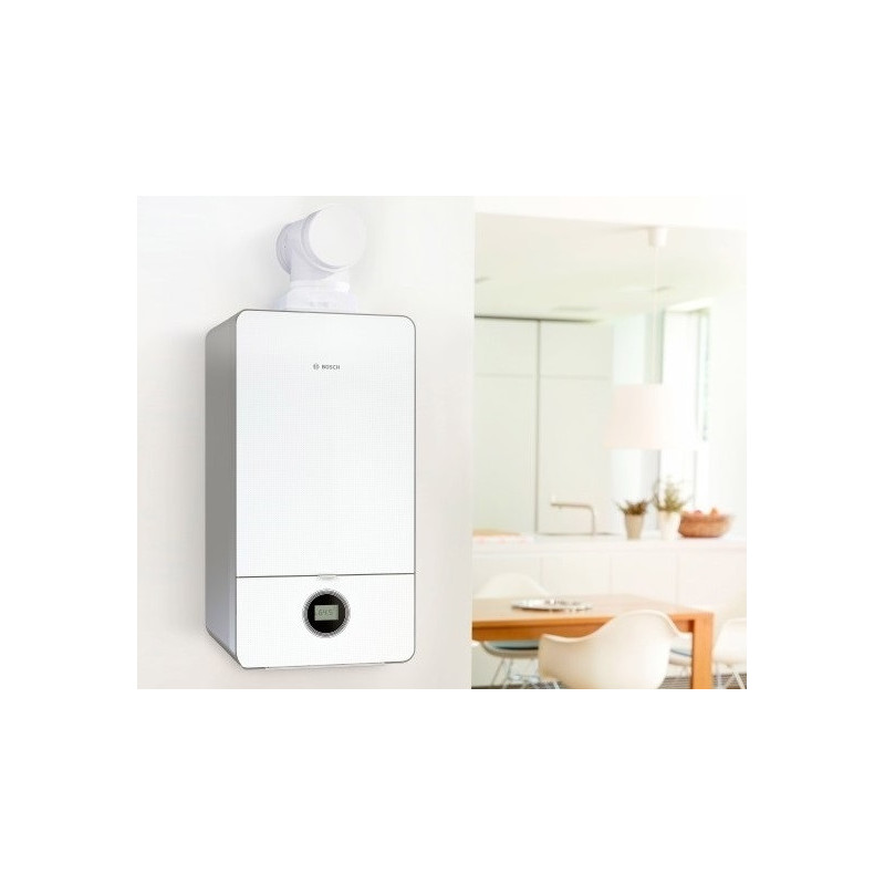 Kondensacinis dujinis katilas Bosch Condens GC 7000iW 35P, 35 kW, grūdinto stiklo paviršius. Katilas skirtas šildyti patalpas ir ruošti karštą vandenį. Katilas su šilumokaičiu, kuris pasižymi itin dideliu vandens srauto pralaidumu, geresniu šilumos atidavimu bei geresne apsauga nuo šilumokaičio užkalkėjimo. Sistema pasižymi mažu išmetamų teršalų į aplinką kiekiu, todėl šis pasirinkimas puikus norint tausoti aplinką. Bosch Condens GC 7000iW 35P katilas su itin aukštu naudingumo koeficientu (93 %), todėl yra puikus pasirinkimas norintiems šildytis ekonomiškai. Bosch Condens GC 7000iW 35P katilą dengianti medžiaga pasižymi garsą sugeriančiomis savybėmis, todėl įrenginio veikimas nekelia papildomo diskomforto. Įdiegta valdymo pagal išorės temperatūrą funkcija, įmontuotas A klasės siurblys ir 12 l išsiplėtimo indas. Katilas suderinamas su Bosch CT100 reguliatoriumi (iki vieno šildymo kontūro) arba internetiniu moduliu MB LAN, kurio dėka galėsite patogiai ir lengvai valdyti šildymo sistemą naudojantis Bosch programėle. Programėlės pagalba galima keisti įrenginio veikimo režimą, temperatūrą, šildymo programą bei gauti pranešimus apie veikimo trikdžius. Katilo ilgaamžiškumą garantuoja efektyvus degimo procesas. Montavimo plokštę reikia užsakyti atskirai. Suteikiama 2 metų garantija.