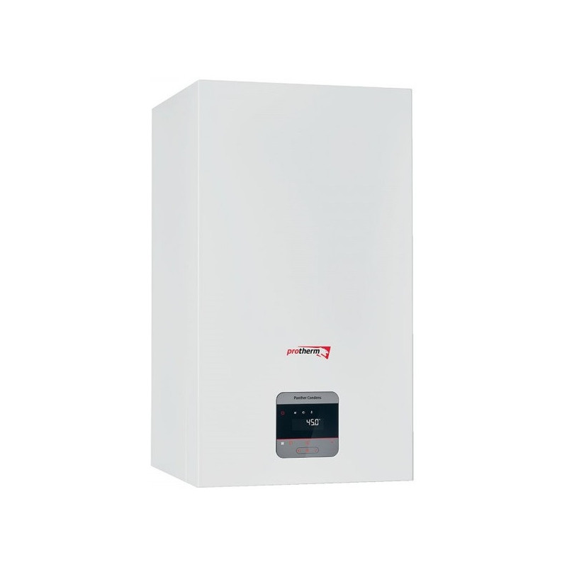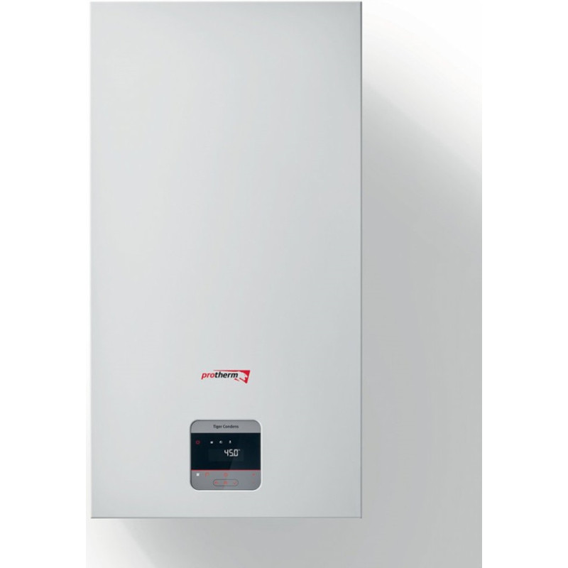 Kondensacinis dujinis katilas Protherm Tiger Condens 20/26 KKZ42-CS/1, 22 kW, su uždara degimo kamera. Katilas skirtas šildyti patalpas ir ruošti karštą vandenį. Katilas su nerūdijančio plieno šilumokaičiu, kuris pasižymi itin dideliu vandens srauto pralaidumu, geresniu šilumos atidavimu bei geresne apsauga nuo šilumokaičio užkalkėjimo. Sistema pasižymi mažu išmetamų teršalų į aplinką kiekiu, todėl šis pasirinkimas puikus norint tausoti aplinką. Protherm Tiger Condens 20/26 KKZ42-CS/1 katilas su itin aukštu naudingumo koeficientu (94%), todėl yra puikus pasirinkimas norintiems šildytis ekonomiškai. Protherm Tiger Condens 20/26 KKZ42-CS/1 katilą dengianti medžiaga pasižymi garsą sugeriančiomis savybėmis, todėl įrenginio veikimas nekelia papildomo diskomforto. Integruotas 12 l talpos išsiplėtimo indas ir 42 l talpos karšto vandens ruošimo indas. Suteikiama 2 metų garantija.