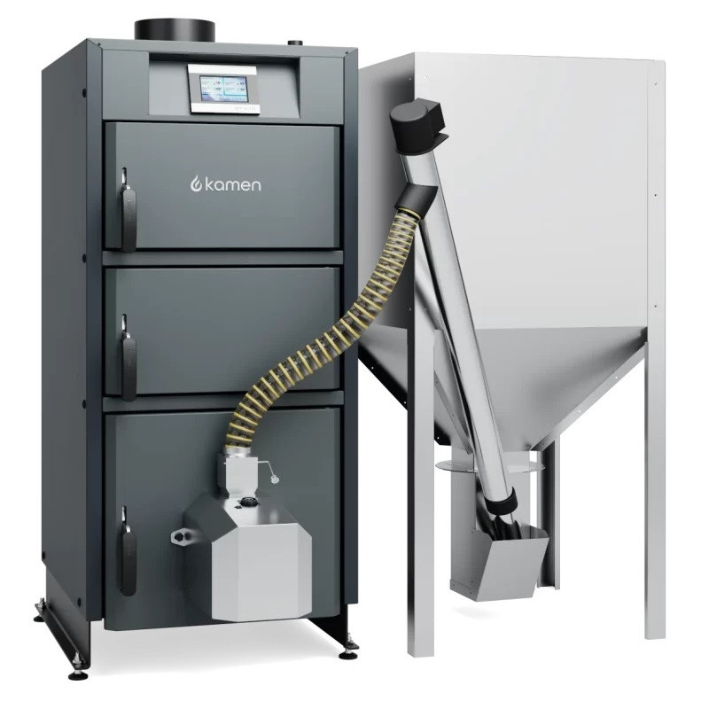 Granulinis katilas Kamen Pellet Kompakt 12 kW - kokybiškas, efektyvus ir patvarus šildymo prietaisas. Aukštos kokybės nerūdijančio plieno degiklis "Comfort" leidžia naudoti katilą be didelės priežiūros. Katilo darbas yra valdomas elektroniniu būdu, kas leidžia katilo darbą pritaikyti prie įvairių šildymo sistemos sąlygų. Degiklyje yra sumontuotas automatinis uždegimas ir gesinimas. Patalpoms sušilus katilas automatiškai gesinasi, o temperatūrai nukritus - užsikurs automatiškai (papildomai reikalinga sumontuoti kambario termostatą). Taip pat katilo Kamen Pellet Kompakt degiklyje integruota "Full Clean" sistema - tai papildoma automatinė pelenų šalinimo sistema mechaniniu būdu. Viršutinės durelės skirtos katilo valymui. Siekiant sumažinti šilumos nuostolius, katilas izoliuotas mineraline vata ir padengtas milteliniu būdu dažyta plienine skarda.