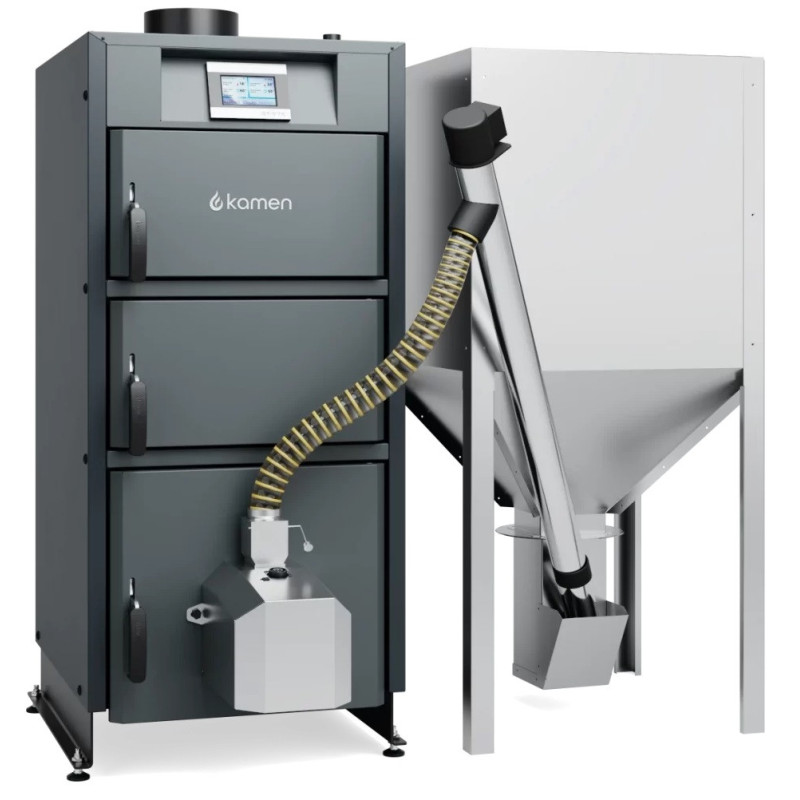 Granulių talpa Kamen, kurioje telpa iki 2000 kg kuro, pasižymi itin aukšta kokybe ir ilgaamžiškumu. Talpykla pagaminta iš patvarios ir kokybiškos cinkuotos skardos. Kamen granulių talpą ypač lengva naudoti kartu su katilu, o montavimo pusę galite pasirinkti patys - talpą galima perkelti į kairę arba dešinę katilo pusę. Talpoje yra vieta granulių padavimo mechanizmui montuoti. Granulių talpyklai Kamen suteikiama 2 metų garantija.