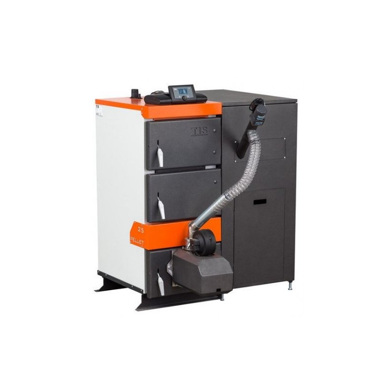 Granulinis katilas TIS PELLET 20, 20kW. Katilas su automatiniu uždegimu ir savaiminiu degiklio išsivalymu. Degimas vykdomas pūtimo būdu (ventiliatoriaus pagalba). Automatika reguliuoja ventiliatoriaus darbą, granulių padavimą, katilo temperatūros palaikymą, 4 siurblių valdymą, pamaišymo vožtuvo valdymą, kambario temperatūros palaikymą, avarinį katilo stabdymą ir gesinimą. Galimybė valdyti TIS PELLET 20 katilą GSM ar interneto pagalba. Suteikiama 5 metų garantija korpusui.