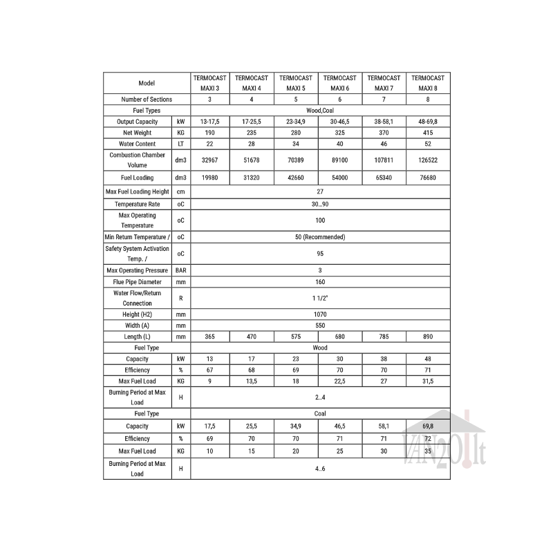 Kieto kuro katilas TERMOCAST MAXI 4 – tai modernus šildymo katilas su triguba dūmų recirkuliacija, kuri užtikrina aukštą kieto kuro katilo efektyvumą. Dėl trigubo dūmų „užlenkimo“ natūraliai didėja jų kontakto su katilo ketaus šilumokaičiu plotas ir perduotos šilumos kiekis. Šilumos nuostoliai yra minimalūs, nes ketinio katilo šilumokaitis patikimai apsaugotas storu neorganinės vatos sluoksniu, padengtu aliuminio folija.