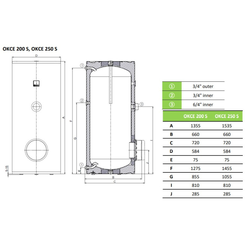 Elektrinis vandens šildytuvas, Talpa - 250 l, Galia priklauso nuo naudojamų priedų, Pastatomas, Su galimybe įstatyti TJ 6/4" teną, Kokybiška izoliacija, Maks. skysčio temperatūra - 80 °C, Matmenys(PxAxG) - 584x1355x584 mm, Pajungimai - 3/4", 6/4"