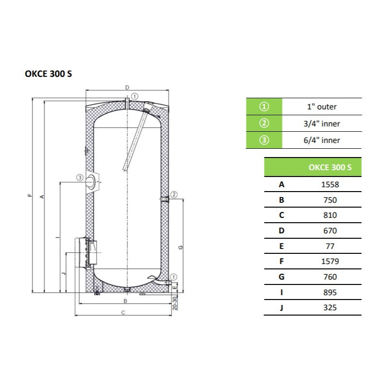 Elektrinis vandens šildytuvas, Talpa - 300 l, Galia priklauso nuo naudojamų priedų, Pastatomas, Su galimybe įstatyti TJ 6/4" teną, Kokybiška izoliacija, Maks. skysčio temperatūra - 80 °C, Matmenys(PxAxG) - 670x1558x670 mm, Pajungimai - 1", 3/4", 6/4"