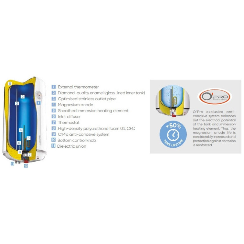 - Dėl išskirtinės „O’Pro“ technologijos bakų eksploatavimo laikas padidėja +50 procentų, o tai padidina „O’Pro CLASSIC“ boilerių kokybę ir ilgaamžiškumą.