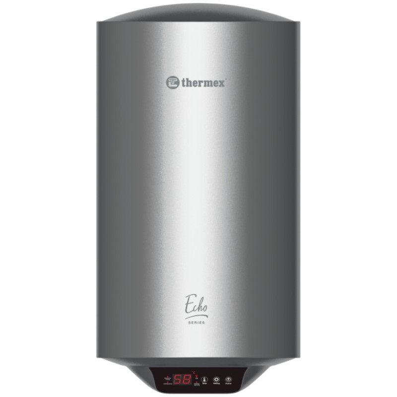 Elektrinis vandens šildytuvas Thermex ECHO Wi-Fi, vertikalus, pakabinamas. Thermex ECHO Wi-Fi serijos vandens šildytuvai su antibakterine vidinio bako danga, pagaminta iš bio stiklo porceliano, kuri užtikrina geresnę apsaugą nuo korozijos ir karšto vandens švarumą. Šildytuvas lengvai valdomas ant jo įrengtu liečiamu ekranu ir naudojant įdiegtą Wi-Fi technologiją, kurios dėka įrenginį nuotoliniu būdu gali valdyti keli vartotojai. Atsisiuntus "Thermex Home" programėlę (suderinama su „Android“ ar „IOS“ operacinėmis sistemomis) yra galimybė stebėti vandens šildytuvo veikimą, naudotis laikmačiu, įjungti/išjungti šildymą, valdyti temperatūrą ar pasirinkti reikiamą šildymo režimą. Integruota funkcija, kuri tikrina šildytuvo darbą ir parodo klaidas ekrane ir "Thermex Home" programėlėje. Integruota "Smart" funkcija, kuri padeda taupyti energiją. Dėl daugybės Thermex ECHO Wi-Fi tūrių, vandens šildytuvas tinka sprendžiant karšto vandens tiekimo į beveik bet kokią patalpą problemas. Suteikiama 2 metų garantija.