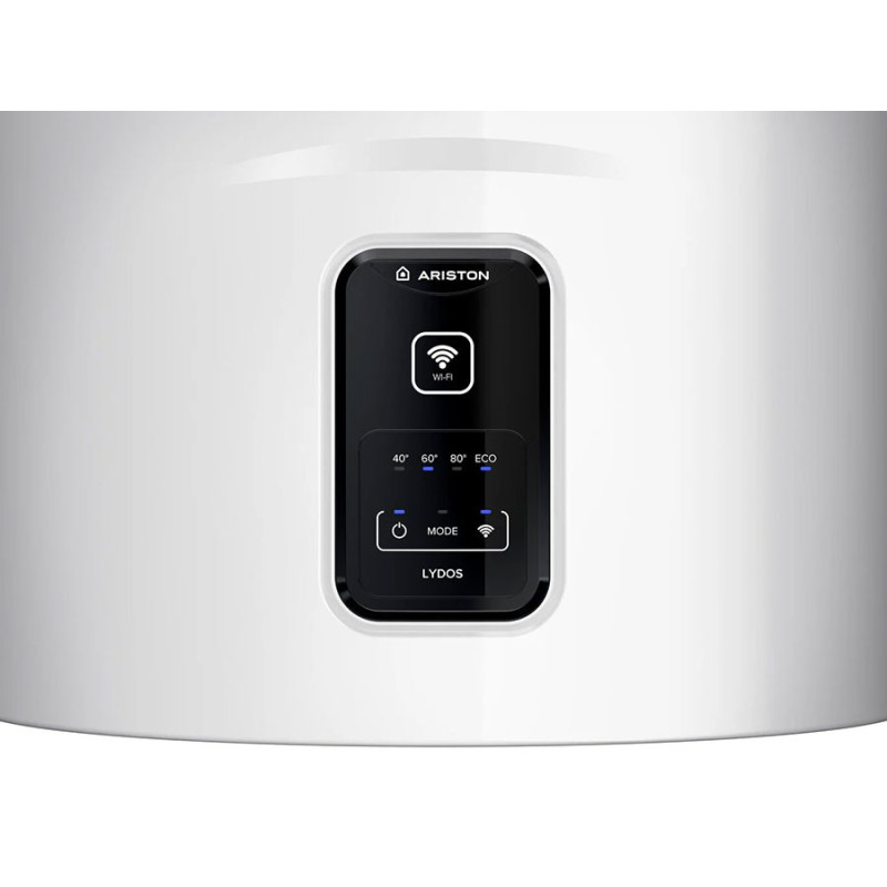 Elektrinis vandens šildytuvas Ariston Lydos WI-FI 80V. Ariston Lydos WI-FI serijos šildytuvai su pagerintu produktyvumu: WaterPlus technologijos dėka, gaunama iki 16% dagiau karšto vandens palyginus su senesnės kartos vandens šildytuvais. CoreTech valdiklio valdoma ECO EVO funkcija, kurios dėka sunaudojama iki 14% mažiau energijos bei apsaugoma nuo bakterijų. Paruošto dušo funkcija LED ekrane leidžia matyti kiek kartų galima nusiprausti duše su paruoštu karšto vandens kiekiu bei kiek liko laiko iki nustatytos temperatūros vandens paruošimo.