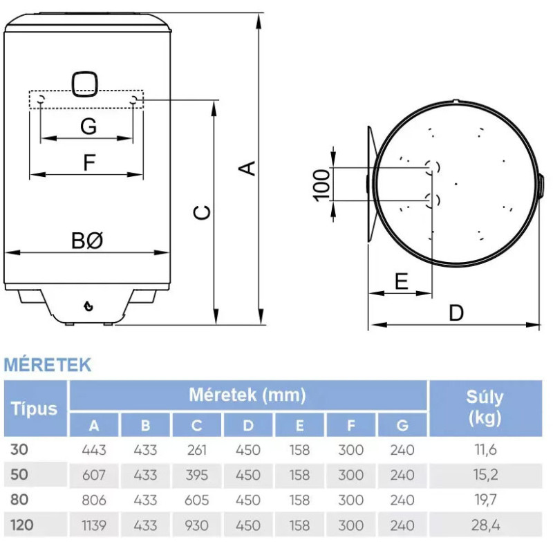 Šis 120 l talpos elektrinis vandens šildytuvas turi 1.5 kW galios neapsaugotą kaitinimo elementą, kuris leidžia pasiekti didelį efektyvumą šildant - ΔT=50°C: 4 h 48 min.