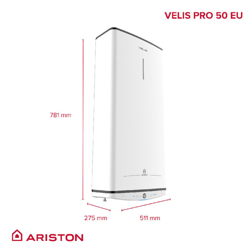 Ariston VELIS PRO 50 yra naujausia italų dizainerio Umberto Palermo kūrinio versija. Šis elegantiškas ir modernus vandens šildytuvas pasižymi aukštos kokybės medžiagomis, pelniusiomis jam prestižinį Good Design Award apdovanojimą. Dėl inovatyvios dvigubo bako technologijos šildytuvo gylis yra tik 27 cm. Prietaisas komplektuojamas su elektros kabeliu ir apsauginiu vožtuvu.