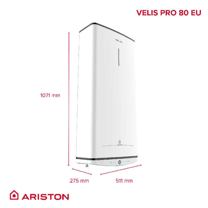 Ariston VELIS PRO 80 yra naujausia italų dizainerio Umberto Palermo kūrinio versija. Šis elegantiškas ir modernus vandens šildytuvas pasižymi aukštos kokybės medžiagomis, pelniusiomis jam prestižinį Good Design Award apdovanojimą. Dėl inovatyvios dvigubo bako technologijos šildytuvo gylis yra tik 27 cm. Prietaisas komplektuojamas su elektros kabeliu ir apsauginiu vožtuvu.
