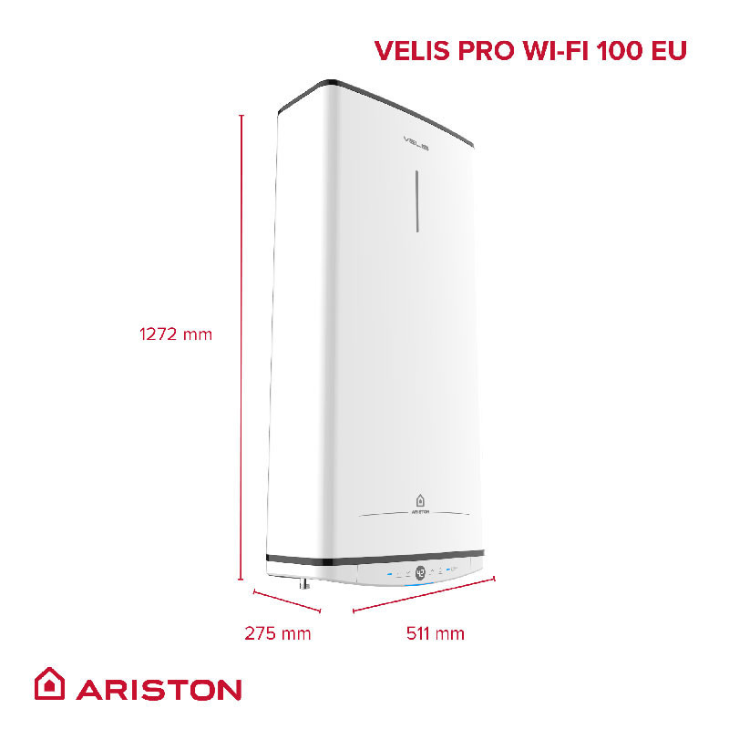 Ariston VELIS PRO WiFi 50 yra naujausia italų dizainerio Umberto Palermo kūrinio versija. Šis elegantiškas ir modernus vandens šildytuvas pasižymi aukštos kokybės medžiagomis, pelniusiomis jam prestižinį Good Design Award apdovanojimą. Dėl inovatyvios dvigubo bako technologijos šildytuvo gylis yra tik 27 cm. Prietaisas komplektuojamas su elektros kabeliu ir apsauginiu vožtuvu.