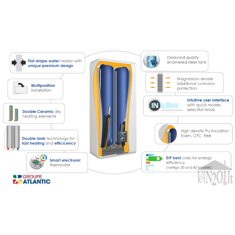 Atlantic VERTIGO yra pirmas pasaulyje „išmanusis“ plokščias vandens šildytuvas su 2 bakais ir 2 apsaugotais nuo sąlyčio su vandeniu sausais keramikiniais kaitinimo elementais STEATITE. Inovacinės technologijos, prancūziškas dizainas ir aukštos kokybės medžiagos - štai pagrindiniai Atlantic VERTIGO privalumai.
