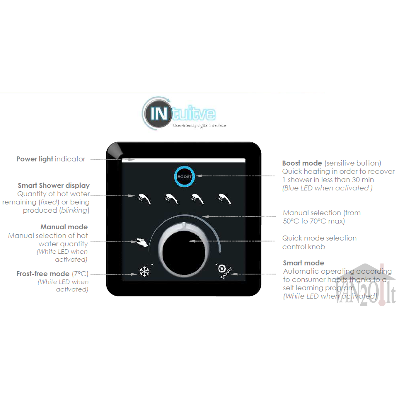 - Greito pašildymo funkcija „BOOST“ - vienas dušas paruošiamas mažiau nei per 30min. Galimybė privirstinai įjungti greitą pašildymą sensorinio mygtuko pagalba