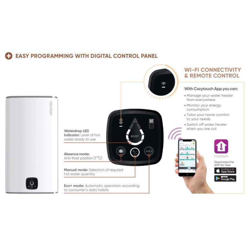 Elektriniai vandens šildytuvai Atlantic Steatite Cube Wi-fi su sausu apsaugotu nuo sąlyčio su vandeniu kaitinimo elementu bei bevieliu valdymu. Sausas kaitinimo elementas šildo vandenį tolygiau ir greičiau nei klasikinis tenas, nes bendras elemento plotas yra didesnis nei standartinio. Dėl to didėja šiluminis laidumas ir šiluma yra efektyviau perduodama vandeniui. Kadangi Steatite kaitinimo elemento karkasas yra keramikinis, net ir atjungus elektrą nuo teno kontaktų, keramikoje akumuliuota šiluma vis dar yra perduodama vandeniui. Wi-fi valdymas suteikia Jums daugiau patogumo, o valdyti boilerį galite net nebūdami prie jo.