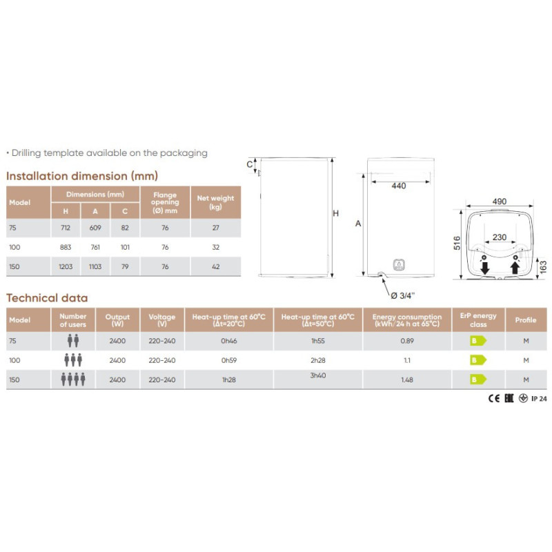 Boileris 150L, Galia 2.4kW, Vertikalus pakabinamas, Wi-fi valdymas, Matmenys(PxAxG) 490x1203x516mm, Apsaugotas kaitinimo elementas