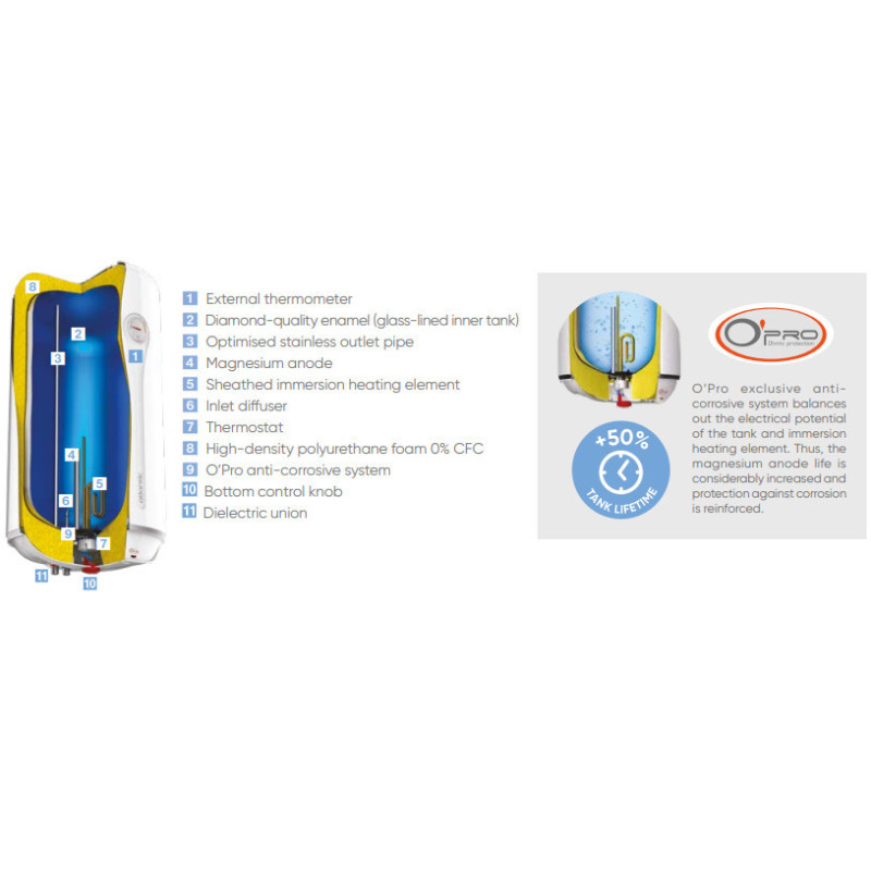 - Dėl išskirtinės „O’Pro“ technologijos bakų eksploatavimo laikas padidėja +50 procentų, o tai padidina „O’Pro CLASSIC“ boilerių kokybę ir ilgaamžiškumą.