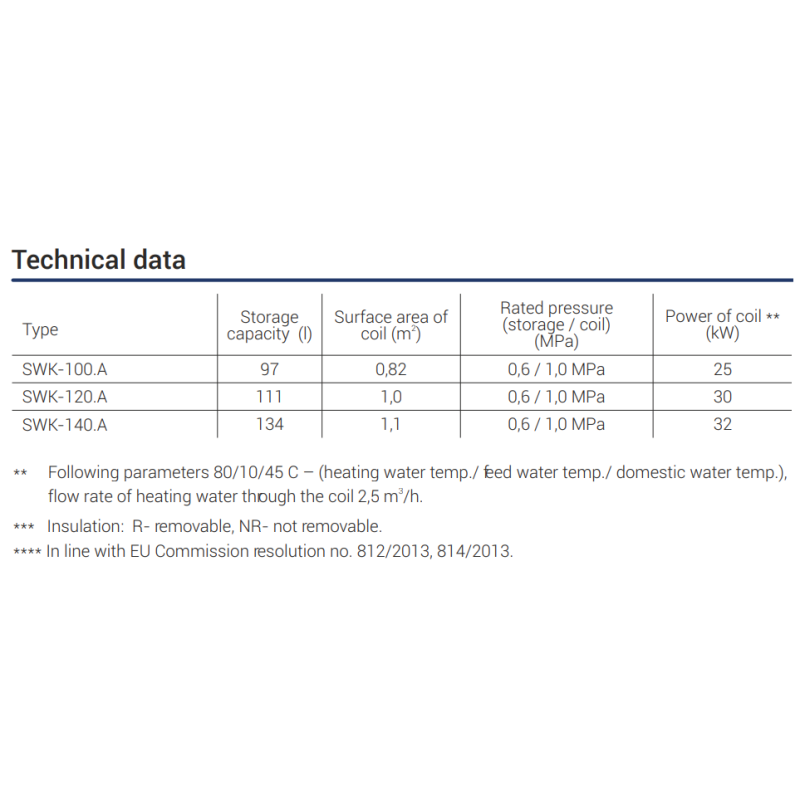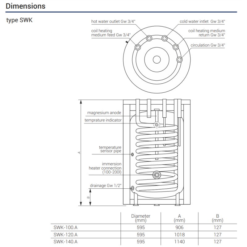 Kospel SWK Termo Top vandens šildytuvai su spiralinio tipo šilumokaičiu puikiai tinka vandens šildymui, dirbant kartu su dujiniu, granuliniu arba kieto kuro katilu. 97-134 litrų boileriuose montuojamas 0.82-1.1m2 pločio šilumokaitis, užtikrinantis apie 25-32kW galingumą ir greitą vandens sušildymą.