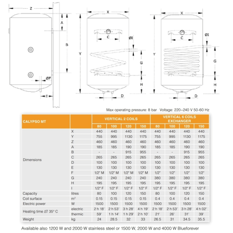 Ferroli Calypso MT kombinuotų vandens šildytuvų bakas pagamintas iš plieno, dengto mėlynojo silikono emaliu, kuris užtikrina ilgalaikę apsaugą nuo korozijos. Apsaugą sustiprina integruotas didelės koncentracijos magnio anodas. Vertikalūs modeliai turi patogų išorinį temperatūros reguliatorių, o aiškūs veikimo indikatoriai leidžia lengvai stebėti įrenginio darbą. Be to, šie vandens šildytuvai aprūpinti apsauginiu vožtuvu, užtikrinančiu saugų veikimą net esant aukštam slėgiui. Gamintojas suteikia 3 metų garantiją bakui ir 2 metų garantiją elektrinėms dalims.