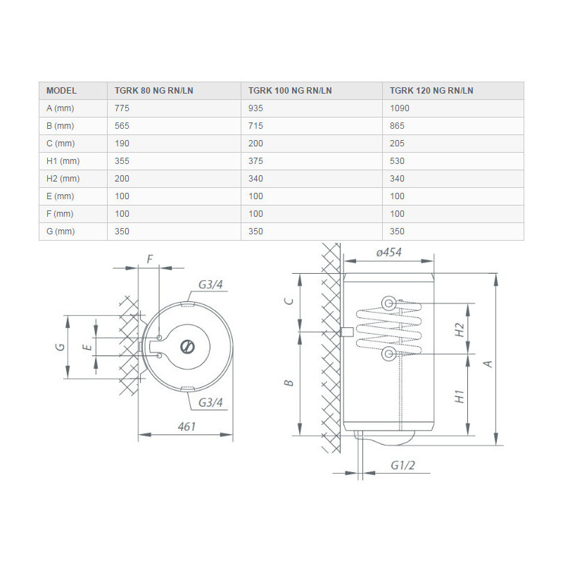 Boileris 94.2L, Galia 2.0kW, Vertikalus, Pajungimas dešinėje, Matmenys 454x935mm