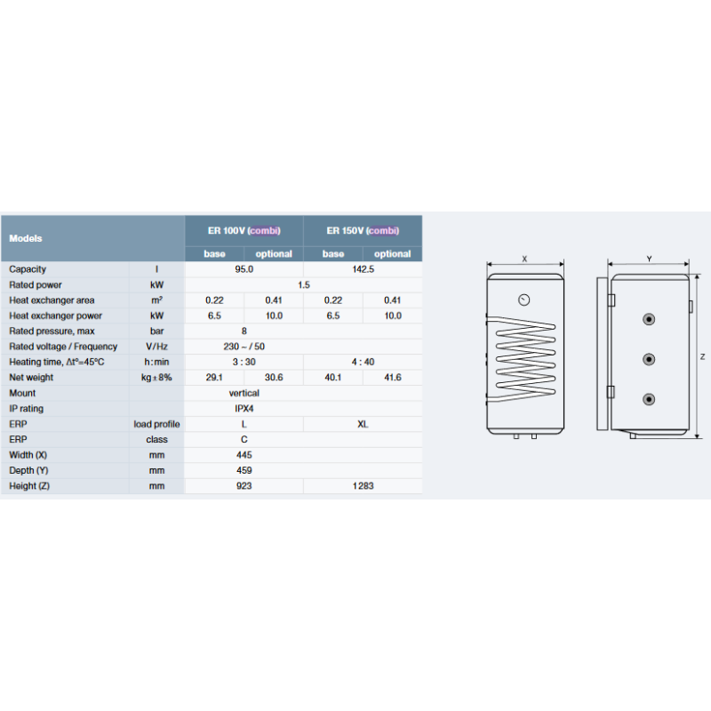 Kombinuotas vandens šildytuvas Thermex ER 150V COMBI 6 coils (su padidintu gyvatuku), kairė. Šildytuvas yra vertikalaus montavimo tipo, pakabinamas. Sušildymo laikas (Δ 45 °C) - 4h40min. Kombinuoto vandens šildytuvo Thermex ER 150V COMBI 6 coils talpa - 150L. Thermex ER COMBI 6 coils serijos vandens šildytuvai su antibakterine vidinio bako danga, pagaminta iš bio stiklo porceliano, kuri užtikrina geresnę apsaugą nuo korozijos ir karšto vandens švarumą.