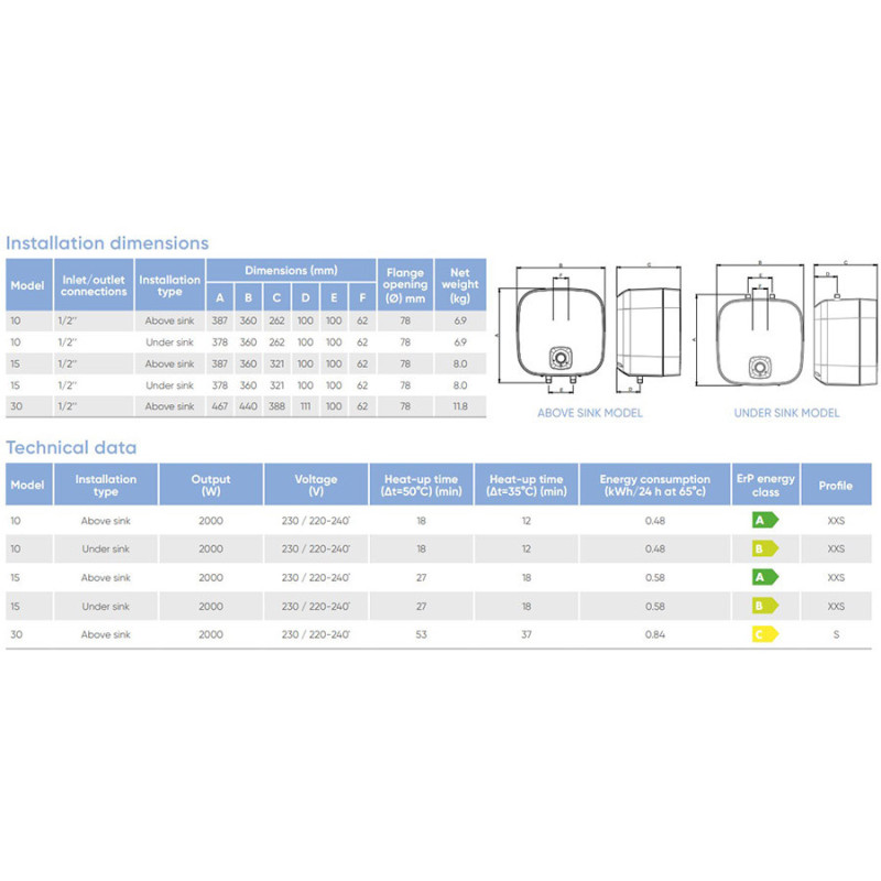 Boileris 30L, Galia 2.0kW, Matmenys 467x440x388mm, Pakabinamas virš kriauklės, ErP energijos efektyvumo klasė C