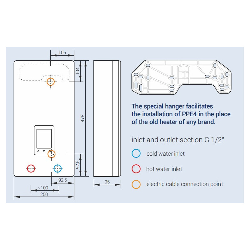 - Patogus montavimas – G 1/2" vandens pajungimo jungtis ir universali tvirtinimo sistema leidžia lengvai pakeisti seną šildytuvą nauju.