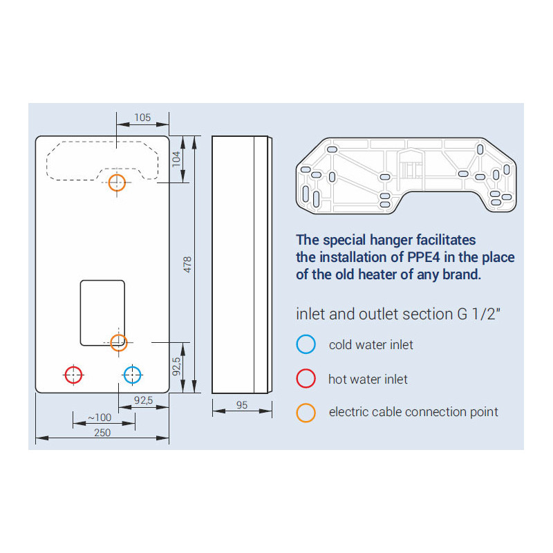 Kospel PPE4.L Lite 27 kW yra sukurtas taip, kad būtų lengvai pritaikomas prie įvairių vandentiekio sistemų. Jo kompaktiški matmenys (478x250x95 mm) leidžia jį montuoti net mažose erdvėse, o standartinės G 1/2" vandens jungtys užtikrina greitą ir lengvą pajungimą prie esamos sistemos.