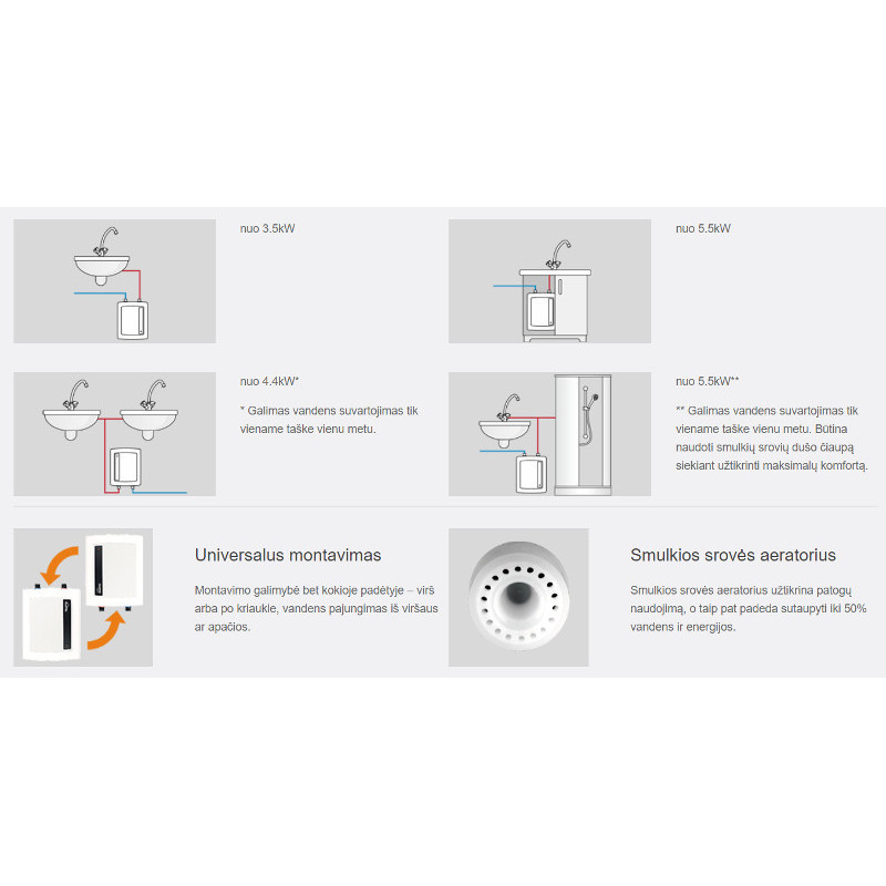 Galia 4.4kW, Įtampa 220V, Srovė 19.1A, Našumas 2.1l/min, Montavimas universalus