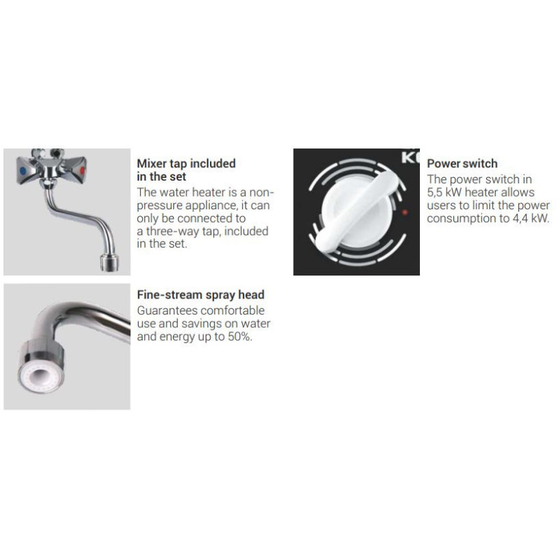 Galia 4.4/5.5kW, Įtampa 220V, Srovė 23.9A, Našumas 2.6l/min, Beslėginis su maišytuvu, Galimybė apriboti galingumą iki 4.4kW