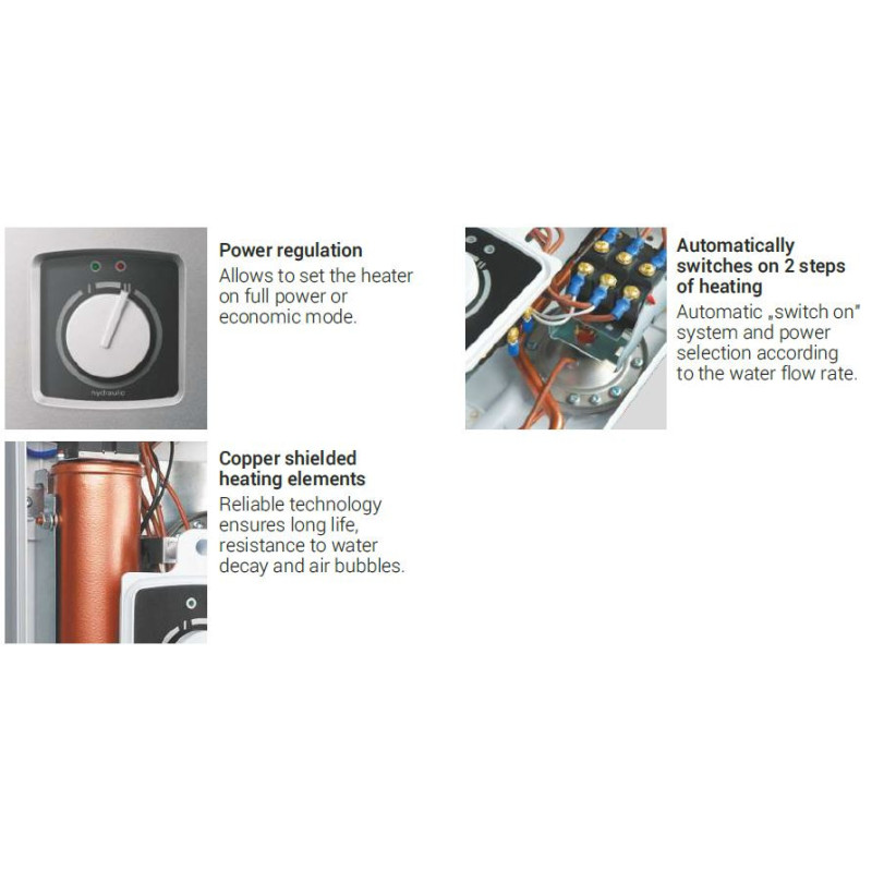 Momentinis vandens šildytuvas Kospel EPMH Hydraulic 8.5kW yra kompaktiškas, atrandantis savo vietą kiekvienuose namuose, jį galima statyti tiek vonioje, tiek ir duše, tiek kitoje pasirinktoje vietoje. Momentinis vandens šildytuvas Kospel EMPH-8.5 Hydraulic parduodamas mūsų elektroninėje parduotuvėje ypač patrauklia kaina. Įrenginiams pagaminti naudojamas specialus vario kaitinimo elementas, kuris gali garantuoti ilgą tarnavimo laiką ir atsparumą vandens irimui bei susidarantiems oro burbuliukams. Šio tipo momentiniams vandens šildytuvai turi 12 mėnesių garantinį laikotarpį. Paprasčiausias būdas įsigyti momentinį vandens šildytuvą – užsisakyti jį internetu.