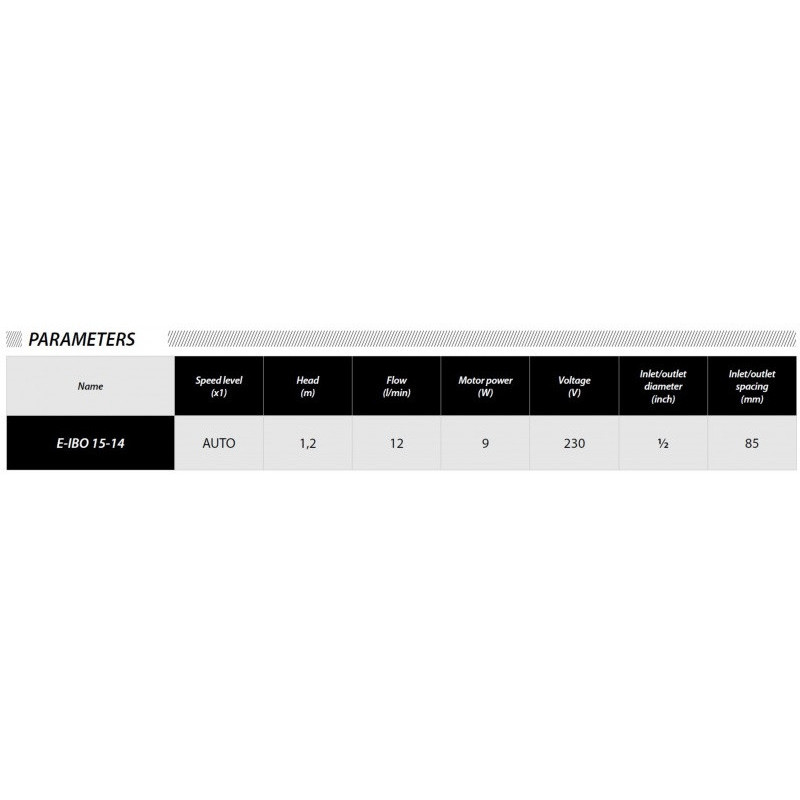 Cirkuliaciniai siurbliai Ibo E-IBO 15-14 naudojami priverstinei karšto vandens cirkuliacijai bei mažose šildymo sistemose, kuriose vandens temperatūra neviršija 95 °C, o slėgis ne didesnis kaip 10 bar. Taip pat siurbliai gali būti naudojami vėdinimo ir oro kondicionavimo sistemose. Cirkuliaciniai siurbliai Ibo E-IBO 15-14 veikia su nuolatinio magneto varikliu, kurio dėka, lyginant su tradiciniais cirkuliaciniais siurbliais, energijos sąnaudos gali sumažėti iki 3 W. Be to, Ibo E-IBO 15-14 cirkuliaciniai siurbliai yra su integruota sferine rotoriaus sparnuote, pagaminta iš "Noryl" medžiagos. Siurblių korpusas pagamintas iš nerūdijančio plieno, o keraminis variklio velenas garantuoja išskirtinį siurblio patvarumą bei ilgaamžiškumą. Šiems Ibo E-IBO 15-14 siurbliams suteikiama 2 metų garantija.