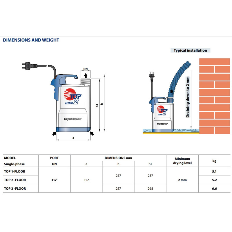 Pedrollo TOP FLOOR drenažiniai vandens siurbliai gali būti naudojami iki 3 m gylyje po vandeniu. Vandens temperatūra neturi viršyti +40 °C, tačiau leistina iki 3 min. eksploatacija prie +90 °C. Minimalus išsiurbimo lygis 2 mm nuo dugno. Siurbliams suteikiama 2 metų garantija.