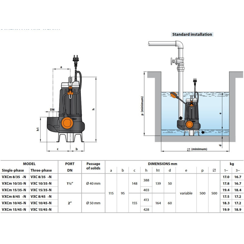 Fekaliniai siurbliai Pedrollo VXC /35-45 gali būti panardinami iki 10 m gylyje. Maksimali veikimo temperatūra yra +40 °C. Veikiant nuolatiniu režimu Pedrollo VXC /35-45 fekaliniams siurbliams minimalus panardinimo lygis yra 290-320 mm. Minimalus įsiurbimo gylis yra 50-60 mm.
