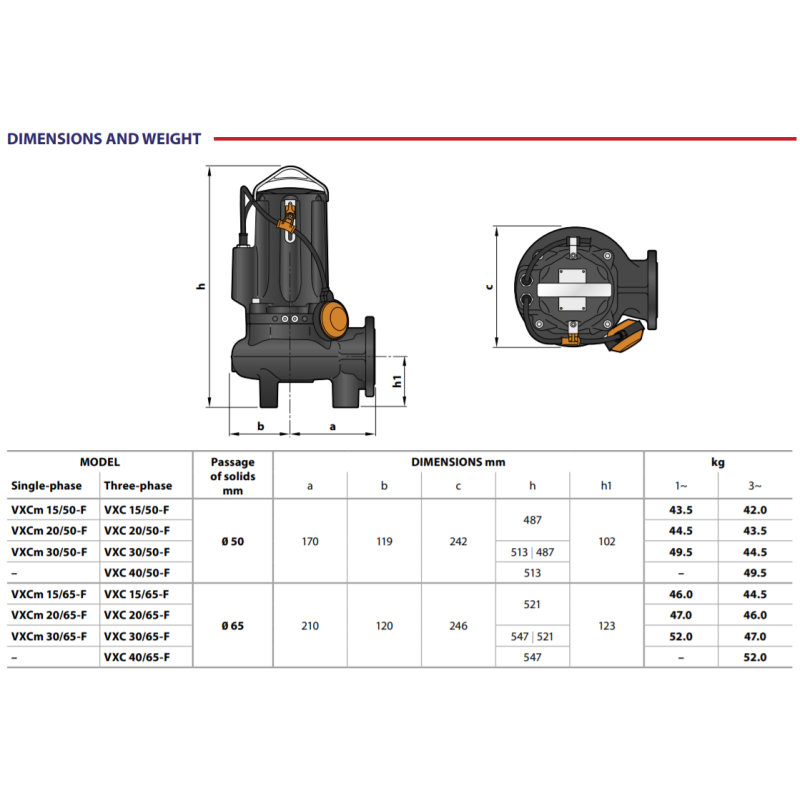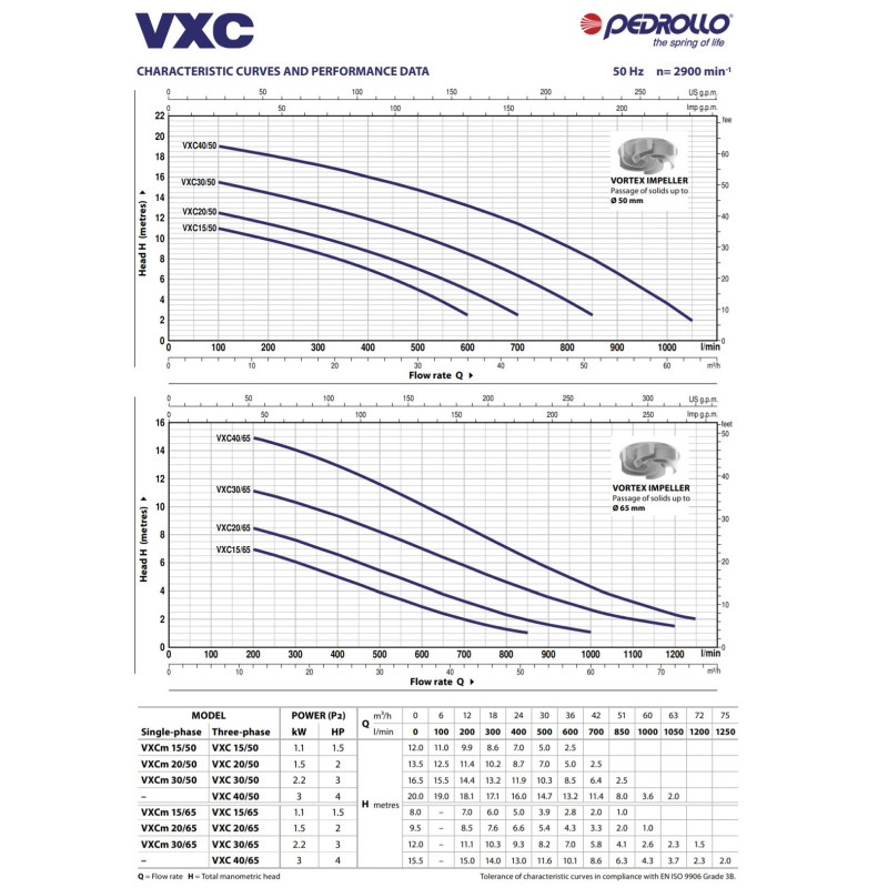 Fekalinis siurblys Pedrollo VXC 40/50, 400 V, pagamintas iš storo ketaus, išskirtinai tvirtas, atsparus dilimui ir ilgaamžis. Pedrollo VXC 40/50 fekaliniai vandens siurbliai (nuotekų siurbliai) yra skirti stipriai purvino vandens pumpavimui buitiniais poreikiais (pvz.: buitiniu šulinių išsiurbimas ir pan.). Pumpuojamas skystis gali turėti iki 50 mm skersmens kietųjų priemaišų. VXC fekalinių siurblių maksimalus panardinimo gylis siekia 10 m, o pumpuojamo skysčio temperatūra negali viršyti 40 °C. Šiuose siurbliuose naudojama VORTEX tipo atvira sparnuotė tinkama nuotekų su didele molio koncentracija išsiurbimui. Fekaliniam siurbliui Pedrollo VXC 40/50 suteikiama 2 metų garantija.