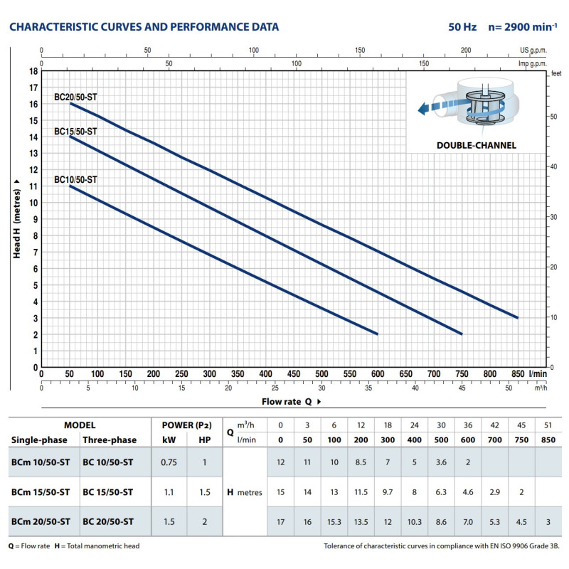 Pedrollo BCm/BC fekaliniai vandens siurbliai gali būti naudojami iki 5 m gylyje. Skysčio temperatūra neturi viršyti +40 °C. Veikiant nuolatiniu režimu Pedrollo BCm/BC 20/50-ST fekaliniams siurbliams minimalus panardinimo lygis yra 360 mm. Pedrollo BCm/BC fekalinių vandens siurblių kietųjų dalelių praeinamumas yra 50 mm, o minimalus įsiurbimo lygis yra 60 mm nuo dugno.