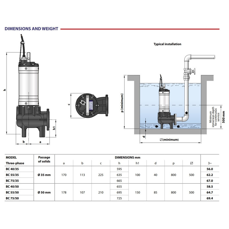Pedrollo BC fekaliniai vandens siurbliai gali būti naudojami iki 10 m gylyje. Skysčio temperatūra neturi viršyti +40 °C. Veikiant nuolatiniu režimu Pedrollo BC fekaliniams siurbliams minimalus panardinimo lygis turi būti ne mažiau 470 mm. Kietųjų dalelių praeinamumas Pedrollo BC /50 siurbiams - iki 50 mm.