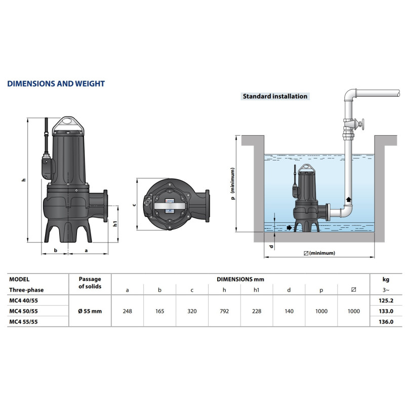 Fekalinis siurblys Pedrollo MC4 55/55, 400 V, pagamintas iš storo ketaus, išskirtinai tvirtas, atsparus dilimui ir ilgaamžis. Pedrollo MC4 55/55 fekaliniai vandens siurbliai (nuotekų siurbliai) yra skirti stipriai purvino vandens pumpavimui buitiniais poreikiais (pvz.: buitiniu šulinių išsiurbimas, vandens išsiurbimas iš požeminių automobilių stovėjimo aikštelių, gamyklų ir pan.). Šie fekaliniai siurbliai tūri dviejų kanalų darbinį ratą iš ketaus, kuris užtikrina stabilų veikimą net esant dideliam kiekiui kietųjų priemaišų. Pumpuojamas skystis gali turėti iki 55 mm skersmens kietųjų priemaišų. Pedrollo MC4 fekalinių siurblių maksimalus panardinimo gylis siekia 10 m, o pumpuojamo skysčio temperatūra negali viršyti 40 °C. Fekaliniam siurbliui Pedrollo MC4 55/55 suteikiama 2 metų garantija.