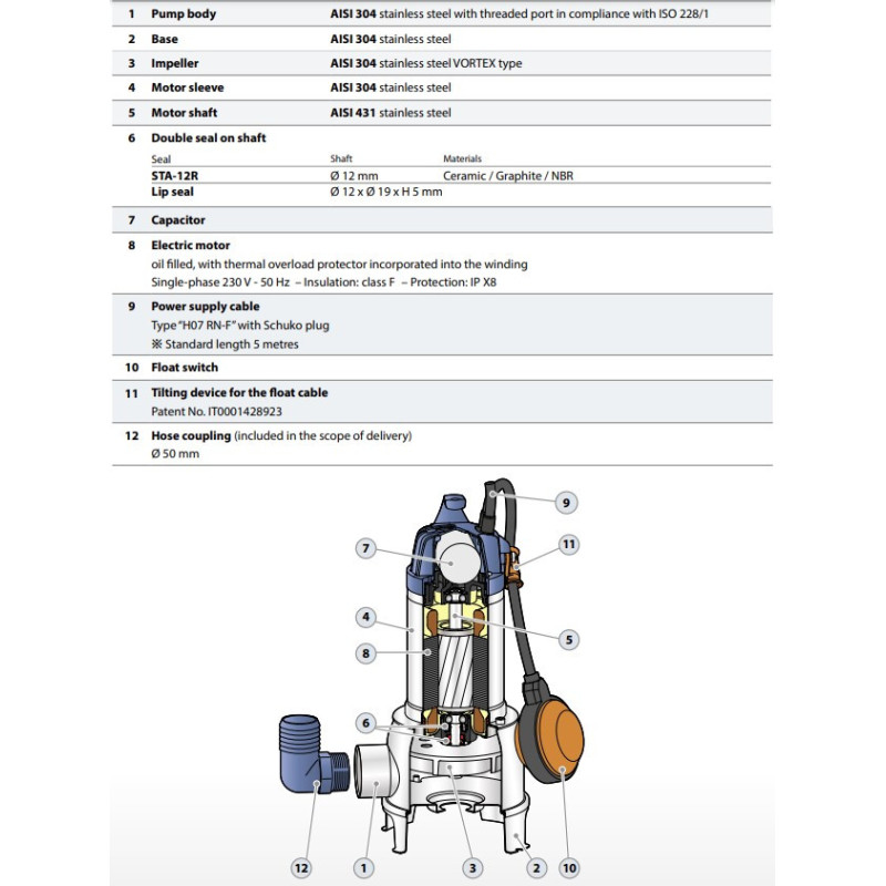 Pedrollo FAMILY fekalinis siurblys (0,50 kW, 230 V) – aukštos kokybės įrenginys, skirtas buitinių ir pramoninių nuotekų pumpavimui. Dėl nerūdijančio plieno korpuso jis yra itin atsparus korozijai, o galinga hidraulinė sistema užtikrina stabilų ir ilgalaikį veikimą net sudėtingomis sąlygomis