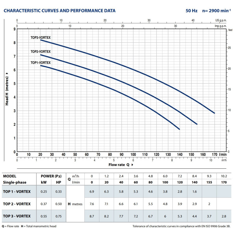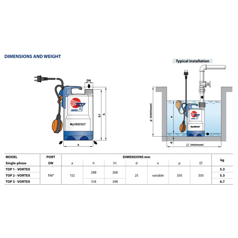 Pedrollo TOP VORTEX drenažiniai vandens siurbliai gali būti naudojami iki 3 m gylyje po vandeniu. Vandens temperatūra neturi viršyti +40 °C, bet leistina periodiška iki 3 min. eksploatacija prie +90 °C. Minimalus išsiurbimo lygis 25 mm nuo dugno.