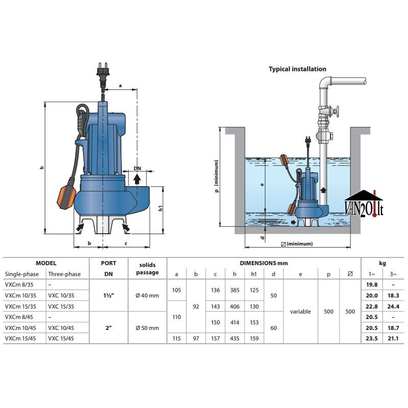 Fekalinis siurblys Pedrollo VXCm - gamintojo specifikacija PDF (anglų k.)