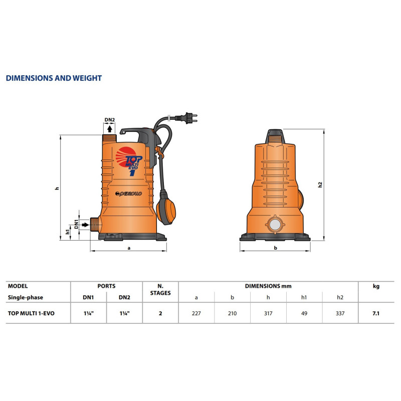Pedrollo TOP MULTI 2 EVO vandens siurbliai skirti vandens arba chemiškai neaktyvių skysčių pumpavimui. Dėl labai aukšto naudingumo koeficiento ir didelio patikimumo, šie panardinami vandens siurbliai naudojami vandens tiekimui iš vandens bakų, rezervuarų, santykinai gilių šulinių arba drėkinimo sistemose. Komplektuojami su 10m kabeliu. Pedrollo TOP MULTI 2 EVO siurbliai skirti naudoti įsiurbimui iš pajungto vamzdžio su plūde (perkama atskirai).