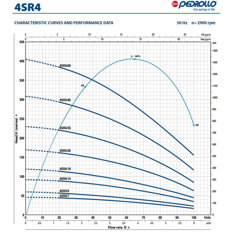 Pedrollo 4SR vandens siurbliai yra 4 colių siurbliai skirti švaraus vandens pumpavimui. Smėlio dalelių koncentracija negali viršyti 150 g/m3. Pedrollo 4SR siurbliai turi aukštą naudingumo koeficientą ir patikimumą, todėl yra plačiai naudojami buityje, žemės ūkyje, pramonėje ir automatiniuose vandens tiekimo sistemose. Taip pat šitie siurbliai naudojami laistymo sistemų užmaitinimui, plovimo mašinose ir priešgaisrinių sistemų slėgio kėlimui.