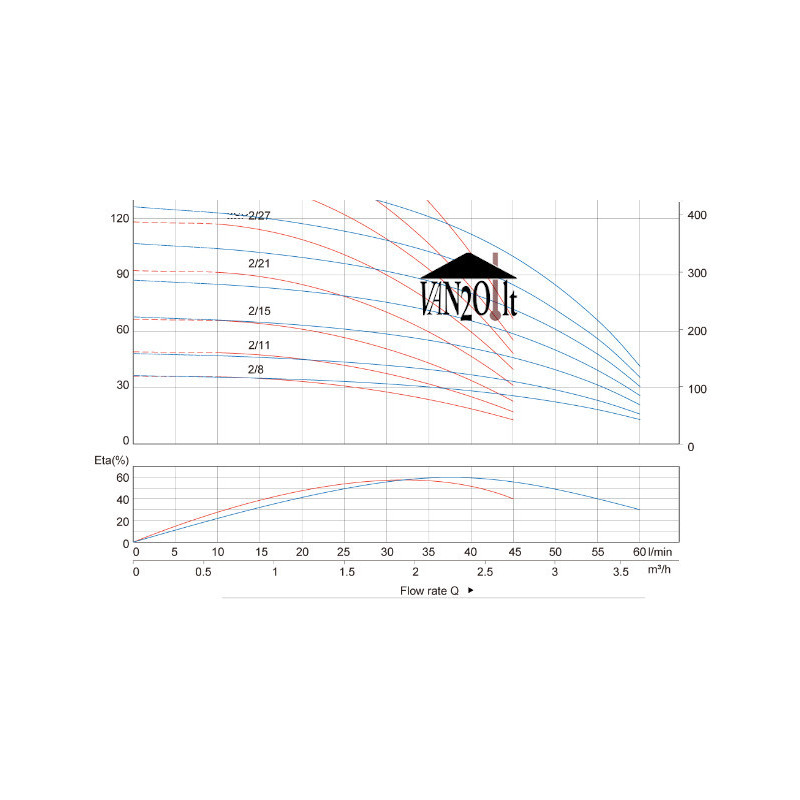 Slėgis 25-115m, Optimalus slėgis 65m, Galia 0.75kW, Našumas 2.76-0.4m³/val., Optimalus našumas 2.0m³/val., Integruotas pultas ir 20m kabelis komplekte