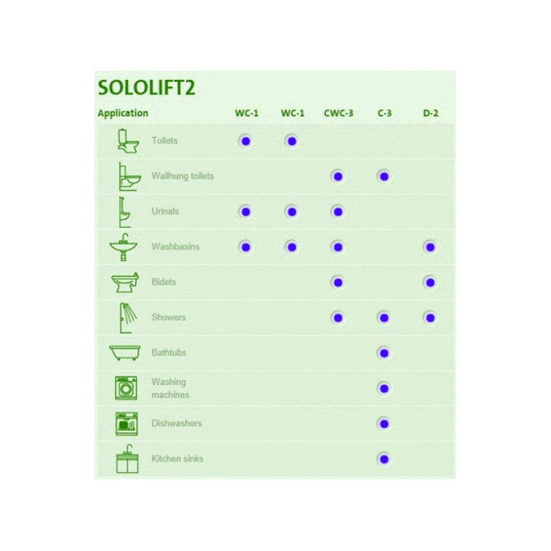 Sololift2 D-2 nuotekų siurblinė - automatinis vandens išsiurbimo įrenginys, skirtas išsiurbti kanalizacijos vandenį gyvenamuosiuose namuose, kur kanalizacijos vanduo negali nutekėti tiesiai žemyn į kolektorių. Sololift2 D-2 paprastai naudojama šalinti karštą vandenį iš žemiau kanalizacijos vamzdžio lygio esančių dušo kabinų, vonių, prasutuvų ar bidė. Šis išsiurbimo įrenginys turi 2 papildomas jungtis.