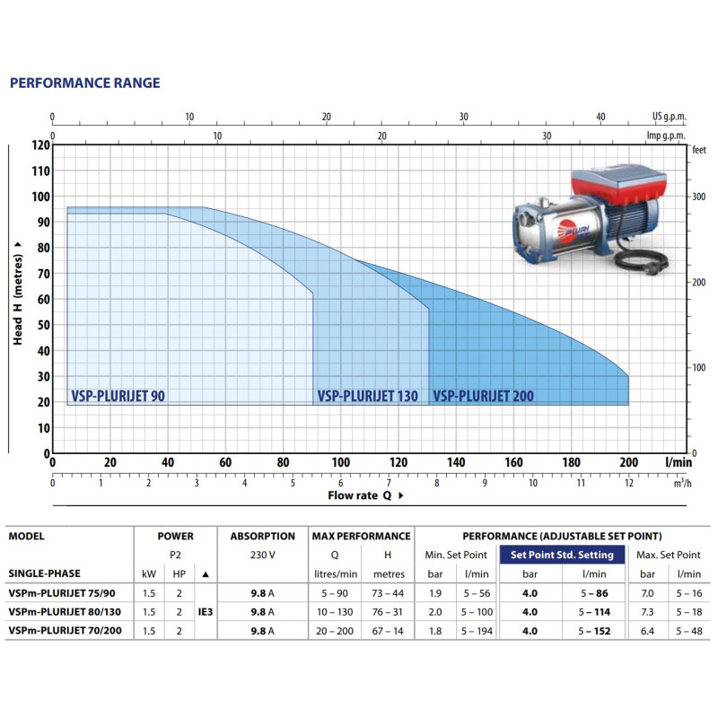 Pedrollo VSPm-PLURIJET 75/90 yra automatinė pastovaus slėgio vandens tiekimo sistema su inverteriu, į kurią integruotas didelio efektyvumo elektrinis siurblys. Šis vandens siurblys idealiai tinka vidaus ir civilinėms slėginio šildymo sistemoms. Pedrollo VSPm-PLURIJET 75/90 siurblyje yra išorinis slėgio jutiklis, kuris visą laiką matuoja slėgio pokyčius. Slėgiui nukritus žemiau nustatytos ribos, siurblys automatiškai didina apsukas ir siekia atstatyti įvykusį pokytį. Integruotas intuityviai valdomas dažnio keitiklis užtikriną tokius pranašumus:
