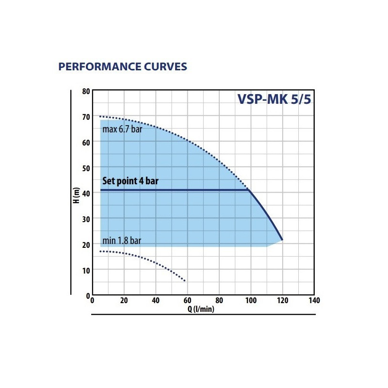 Pedrollo VSP-MK 3/5 yra automatinė pastovaus slėgio vandens tiekimo sistema su inverteriu, į kurią integruotas didelio efektyvumo elektrinis siurblys. Šis vandens siurblys idealiai tinka vidaus ir civilinėms slėginio šildymo sistemoms. Pedrollo VSP-MK 3/5 siurblyje yra išorinis slėgio jutiklis, kuris visą laiką matuoja slėgio pokyčius. Slėgiui nukritus žemiau nustatytos ribos, siurblys automatiškai didina apsukas ir siekia atstatyti įvykusį pokytį. Integruotas intuityviai valdomas dažnio keitiklis užtikriną tokius pranašumus: