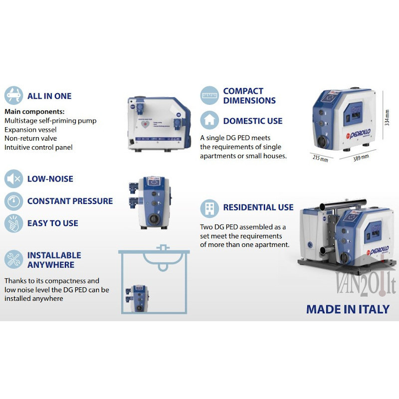Pedrollo DG PED5 yra automatinė pastovaus slėgio vandens tiekimo sistema su inverteriu, į kurią integruotas didelio efektyvumo savisiurbis siurblys, hidroforo talpa, slėgio ir srauto greičio jutikliai ir atbulinis vožtuvas.