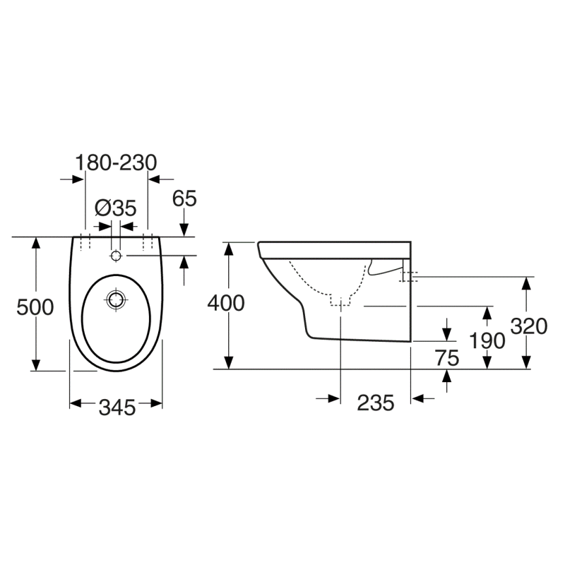 Pakabinama bidė, Su persipylimu, Baltos spalvos, Matmenys (PxAxG) - 345x400x500 mm, Reguliuojamas 180/230 mm atstumas tarp varžtų, Tinka Gustavsberg Triomont potinkiniams rėmams, 2 metų garantija