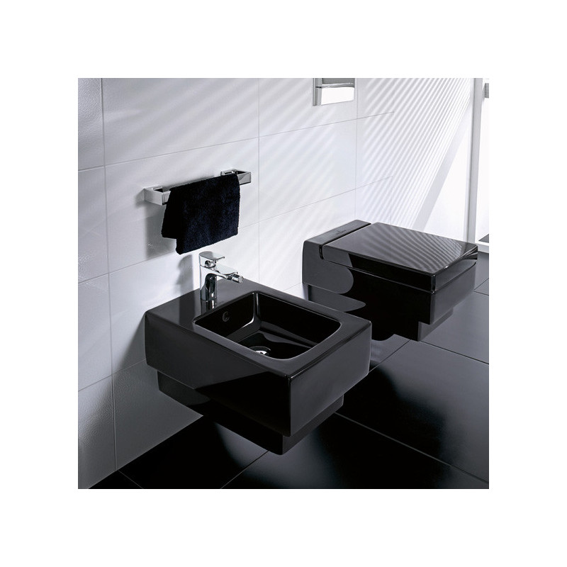 Pakabinama bidė Villeroy&Boch Memento su persipylimu ir skyle maišytuvui centre, juodos spalvos. Bidė yra draugiškas aplinkai įrenginys, kurio dėka sumažinsite sunaudojamo tualetinio popieriaus kiekį. Bidė valdomas labai paprastai - taip pat, kaip vandens maišytuvai. Bidė turi plačias panaudojimo galimybes - galima naudoti kaip praustuvą kai kurių drabužių plovimui, nuprausti augintinį ir t.t. CeramicPlus danga neleis kauptis purvui, o dėka jos valymas taps dar greitestis ir ekologiškesnis dėl mažiau naudojamų cheminių priemonių. Komplektuojama su tvirtinimo elementais užslėptam montavimui. Bidė Villeroy&Boch Memento tarnaus ilgą laiką - suteikiama 5 metų garantija.